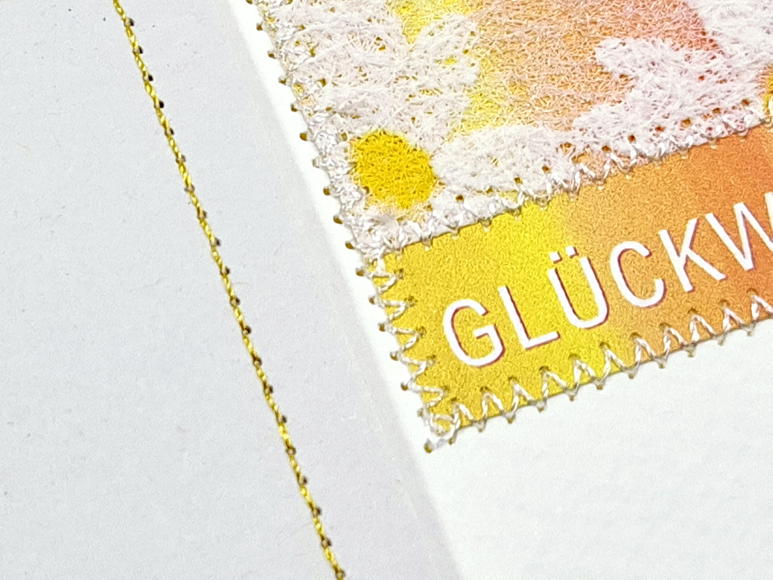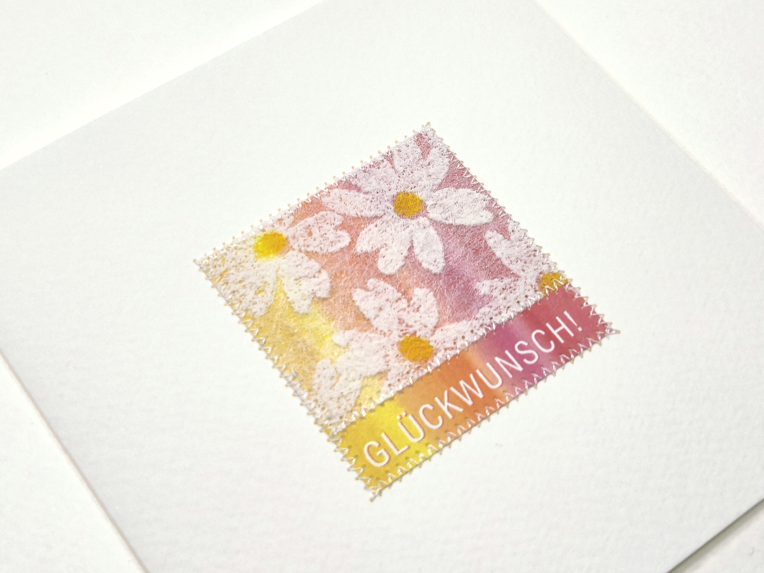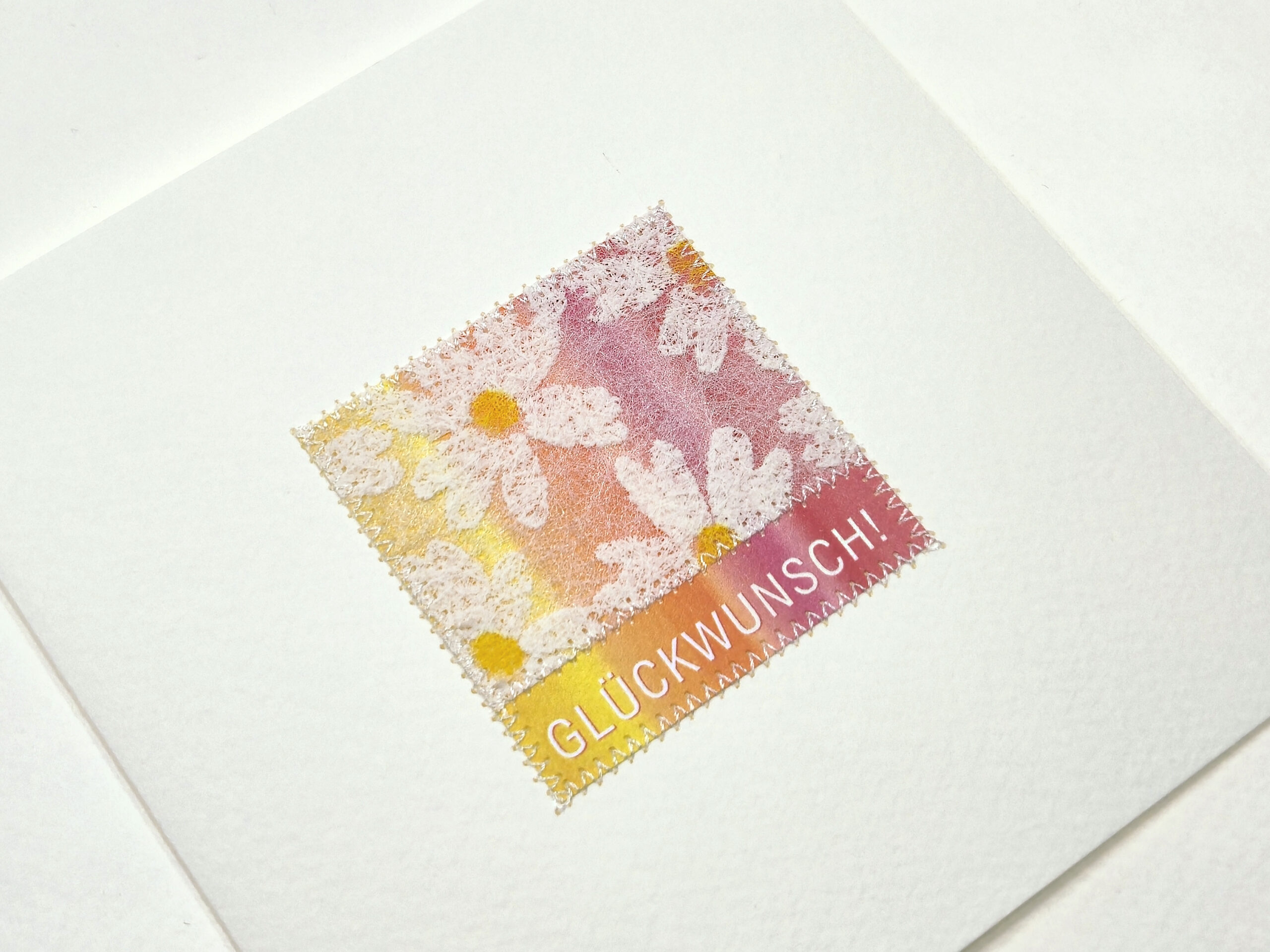 Feine weiße Nähte für die Karte, gelbe Stepp-Nähte für das Kuvert.