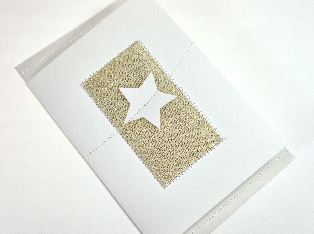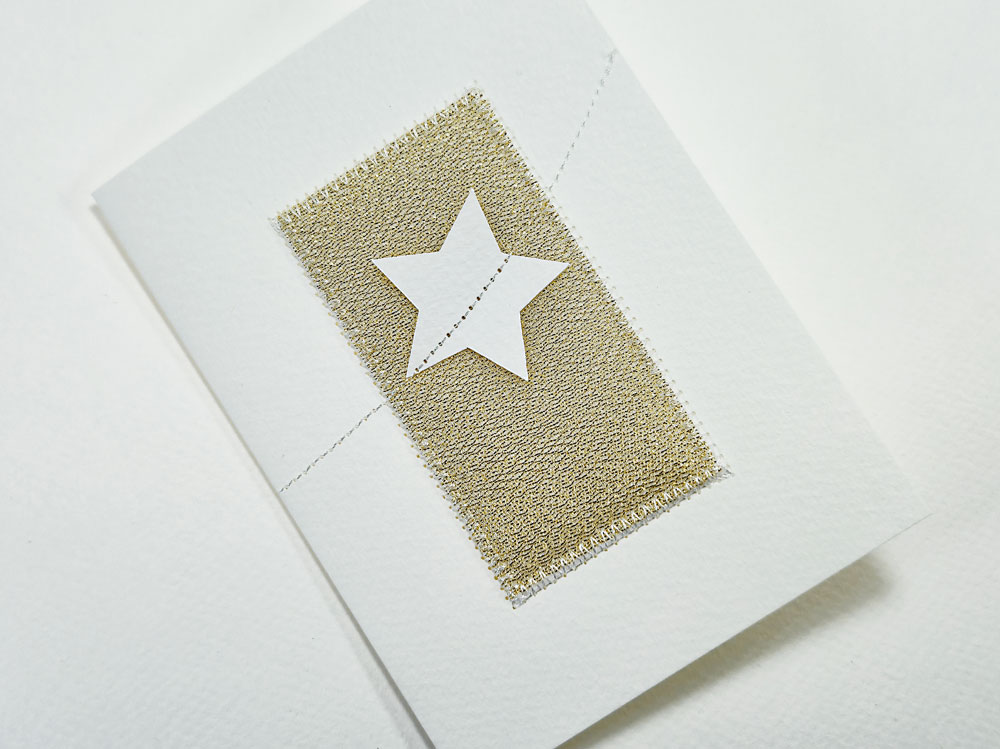 ein weißer Stern (aus Papier) der mit schwungvoller Naht über das gepolsterte Feld aus gold-schimmerndem Stoff „fliegt“.